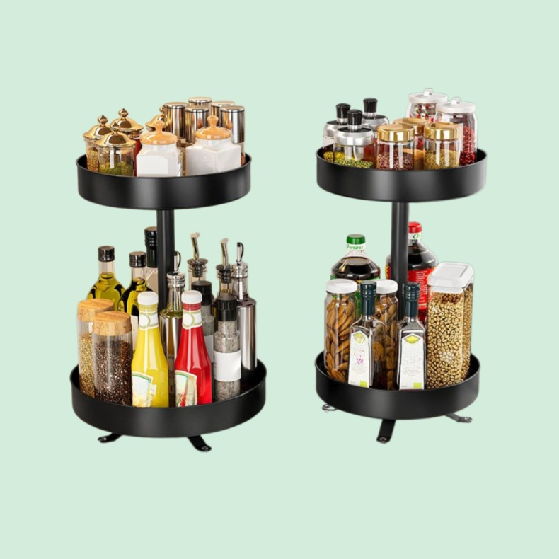 360度回転式スパイスラックで省スペース収納、調味料が一目で見やすいデザイン、キッチン整理に最適。